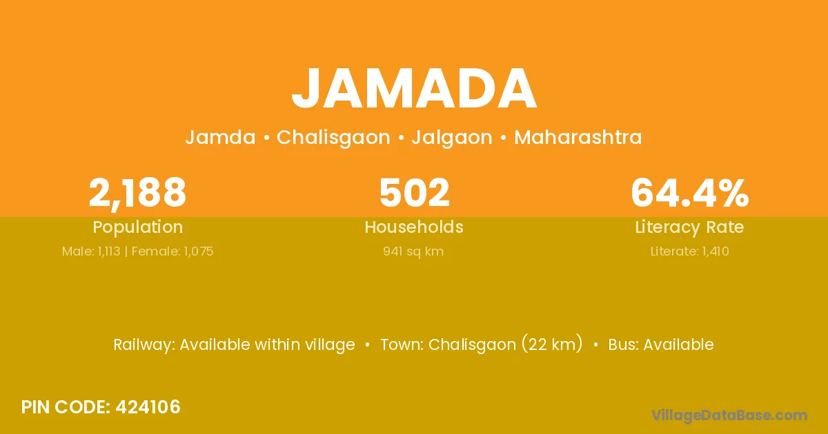 The literacy rate of Jamada village is 61.47%. Male literacy stands at 71.34% and female literacy at 50.82%.