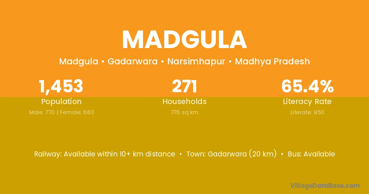 Gadarwara (20 km) is the nearest town to Madgula village for major economic activities and is located approximately 20 km away.