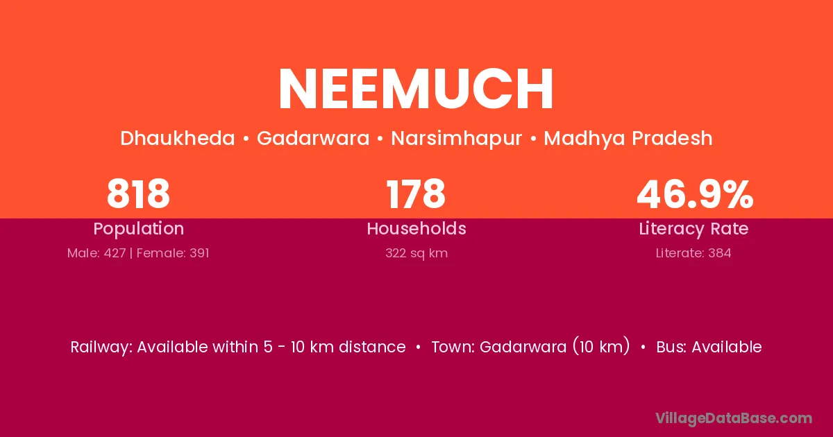 Gadarwara (10 km) is the nearest town to Neemuch village for major economic activities and is located approximately 10 km away.