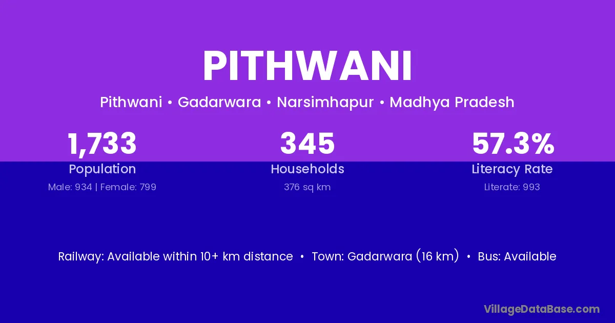 Gadarwara (16 km) is the nearest town to Pithwani village for major economic activities and is located approximately 16 km away.