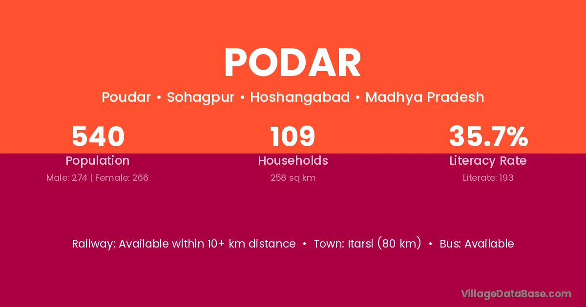 Gadarwara (17 km) is the nearest town to Podar village for major economic activities and is located approximately 17 km away.