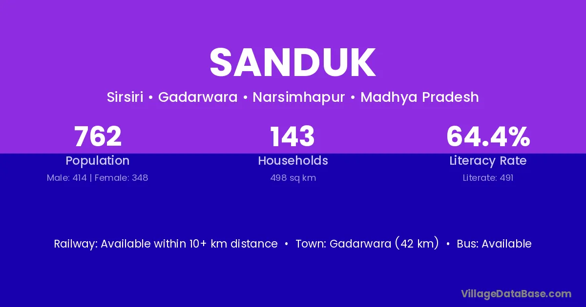 Gadarwara (42 km) is the nearest town to Sanduk village for major economic activities and is located approximately 42 km away.