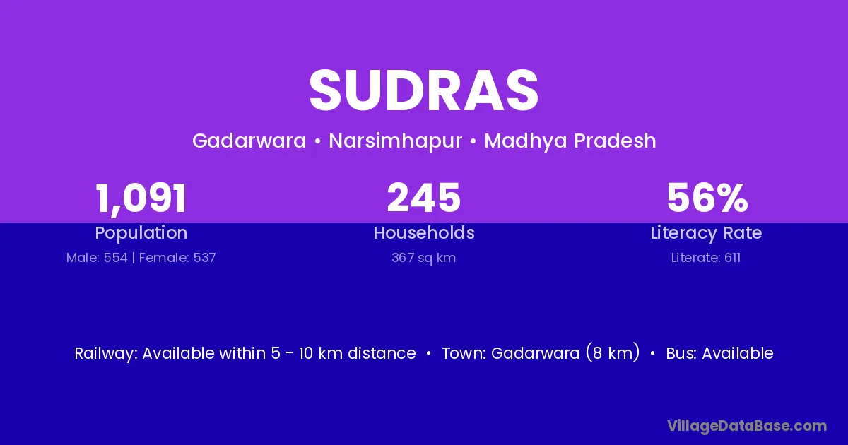Gadarwara (8 km) is the nearest town to Sudras village for major economic activities and is located approximately 8 km away.