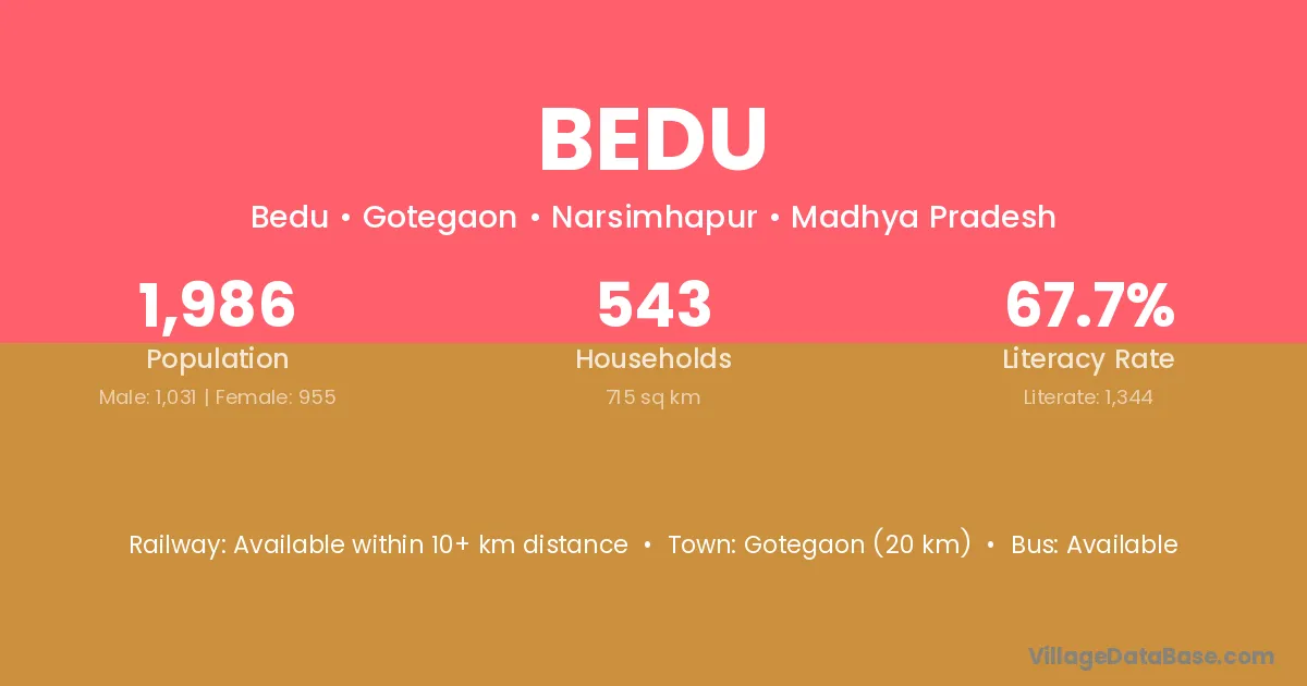 Gotegaon (20 km) is the nearest town to Bedu village for major economic activities and is located approximately 20 km away.