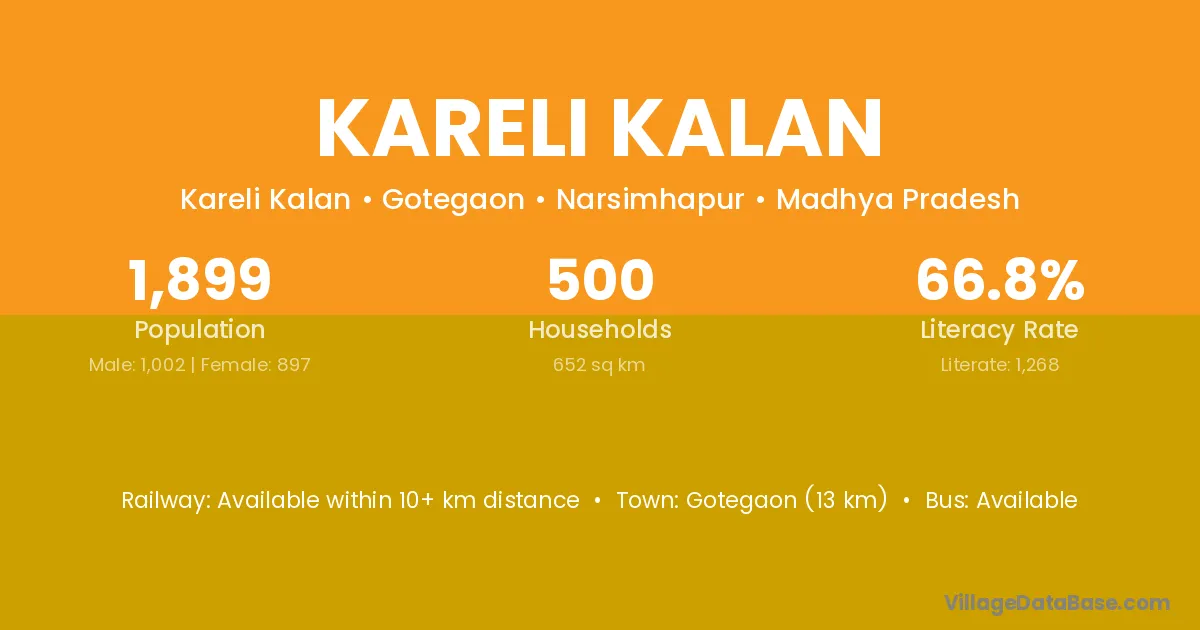 Gotegaon (13 km) is the nearest town to Kareli Kalan village for major economic activities and is located approximately 13 km away.