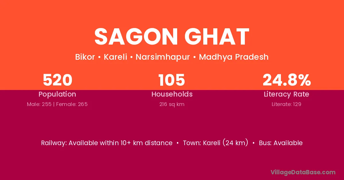Kareli (24 km) is the nearest town to Sagon Ghat village for major economic activities and is located approximately 24 km away.
