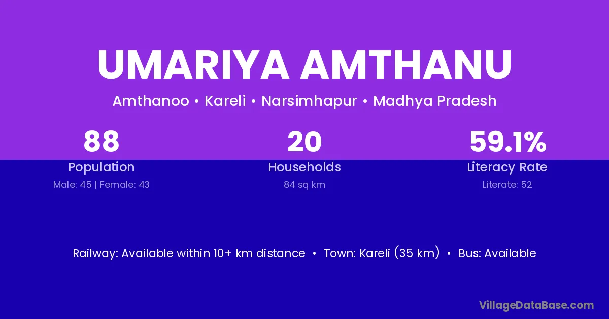 Kareli (35 km) is the nearest town to Umariya Amthanu village for major economic activities and is located approximately 35 km away.