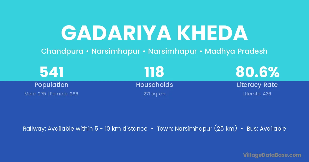 Narsimhapur (25 km) is the nearest town to Gadariya Kheda village for major economic activities and is located approximately 25 km away.