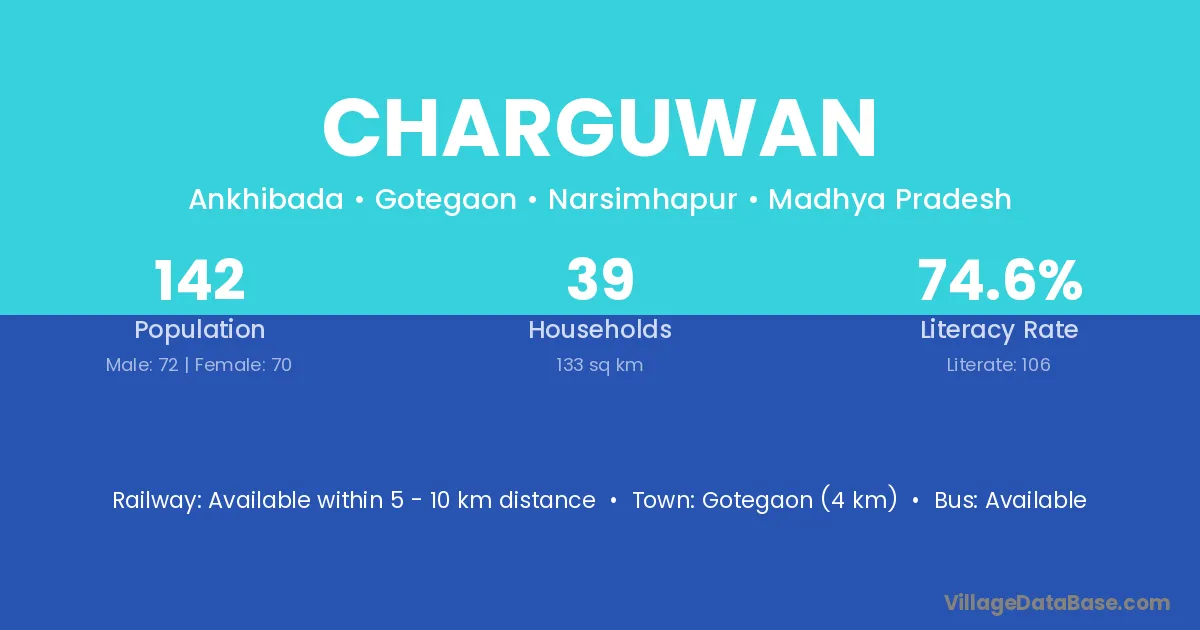 Tendukheda (24 km) is the nearest town to Charguwan village for major economic activities and is located approximately 24 km away.