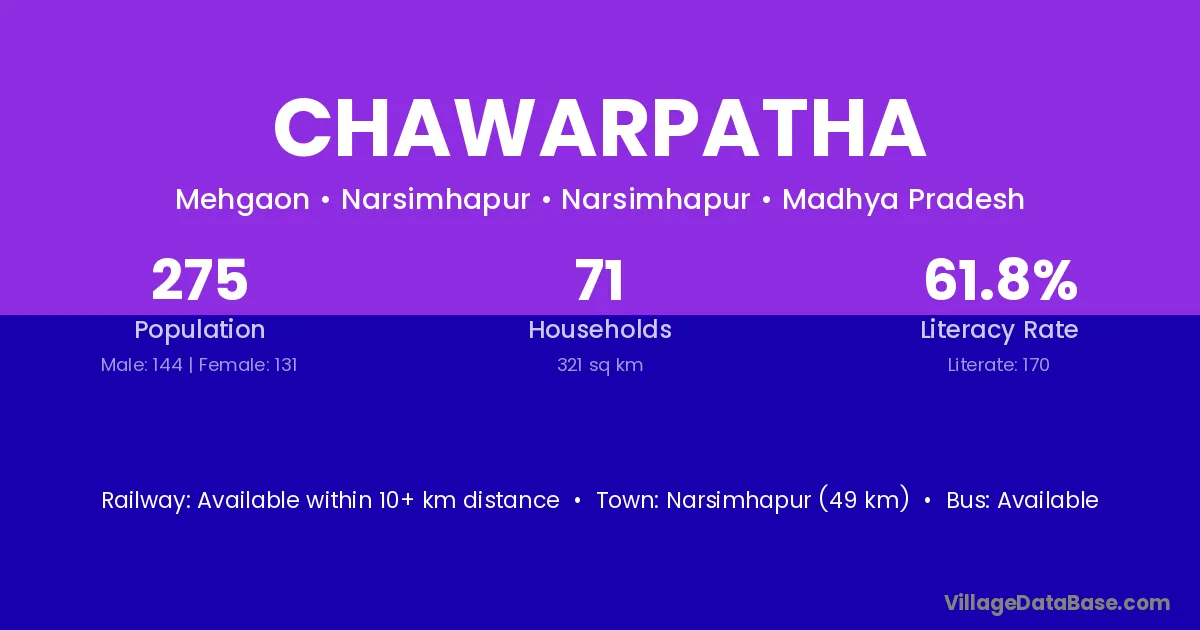 Kareli (20 km) is the nearest town to Chawarpatha village for major economic activities and is located approximately 20 km away.