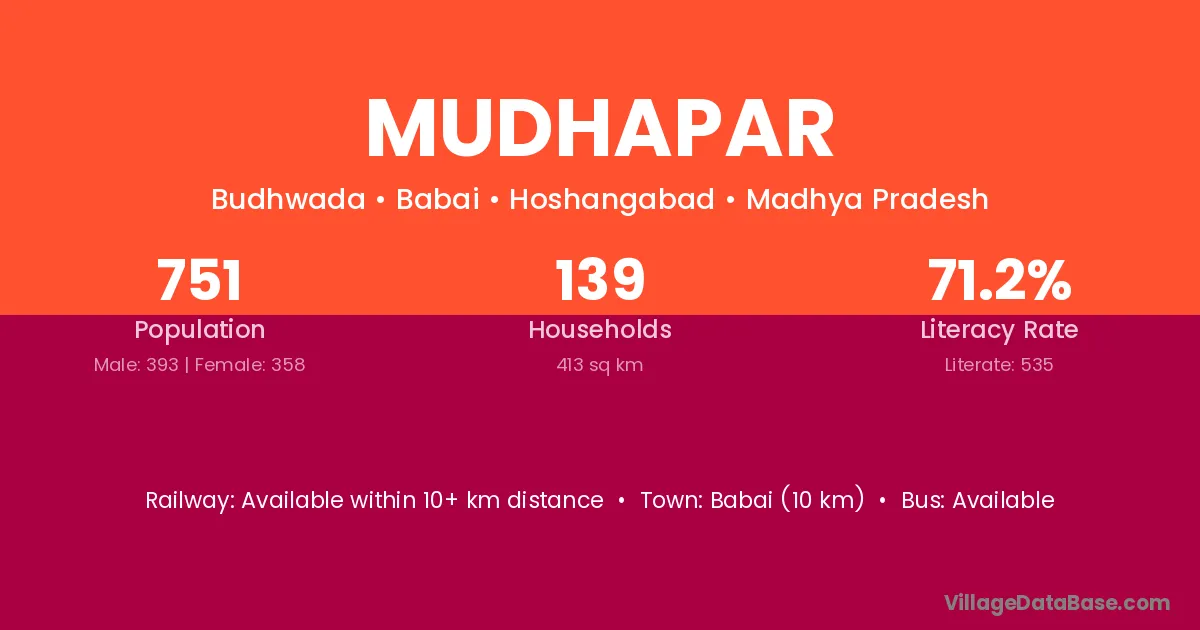 Tendukheda (10 km) is the nearest town to Mudhapar village for major economic activities and is located approximately 10 km away.