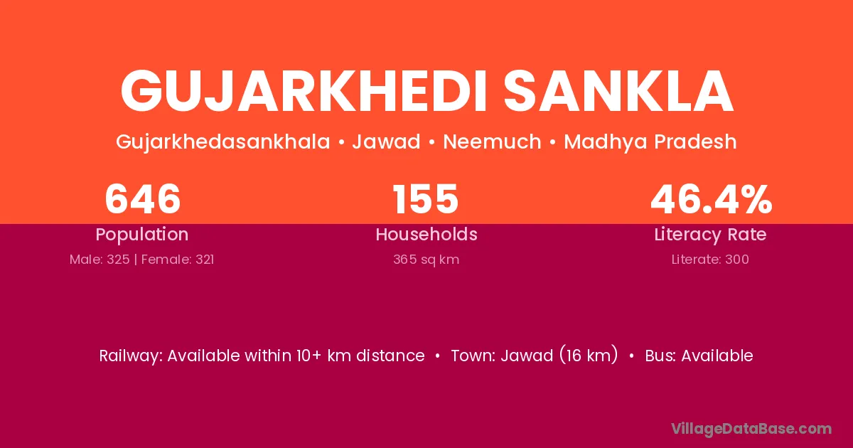 Jawad (16 km) is the nearest town to Gujarkhedi Sankla village for major economic activities and is located approximately 16 km away.