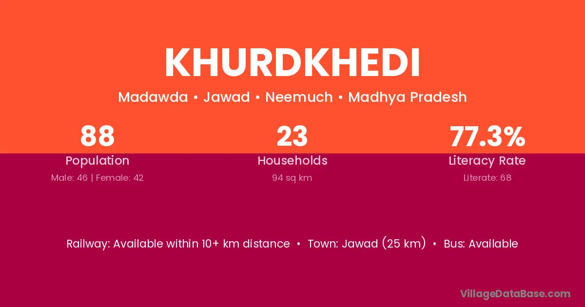 Khurdkhedi village has a total population of 88 people, of which 46 are males and 42 are females.