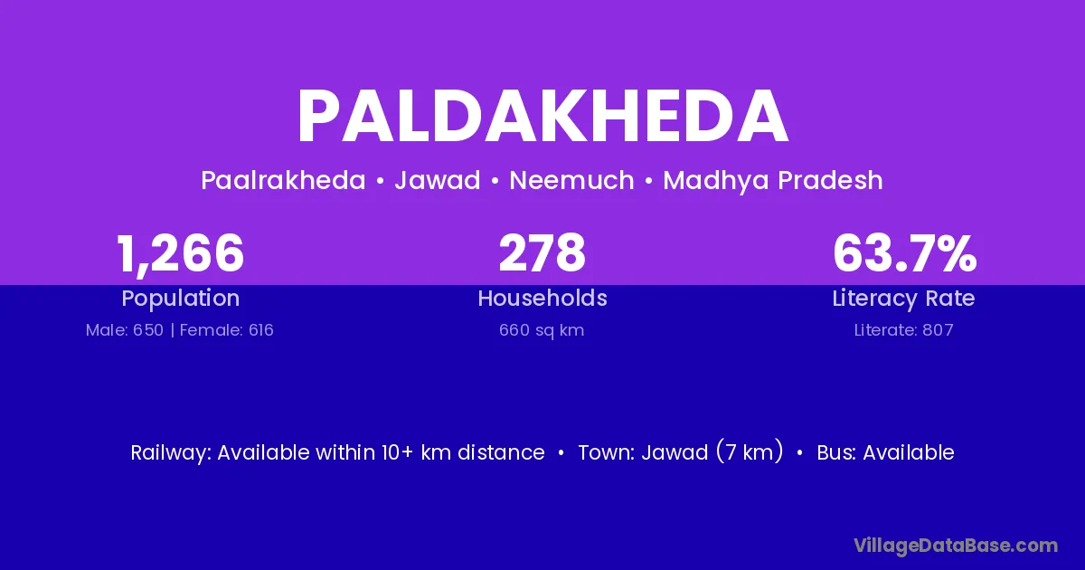 Jawad (7 km) is the nearest town to Paldakheda village for major economic activities and is located approximately 7 km away.