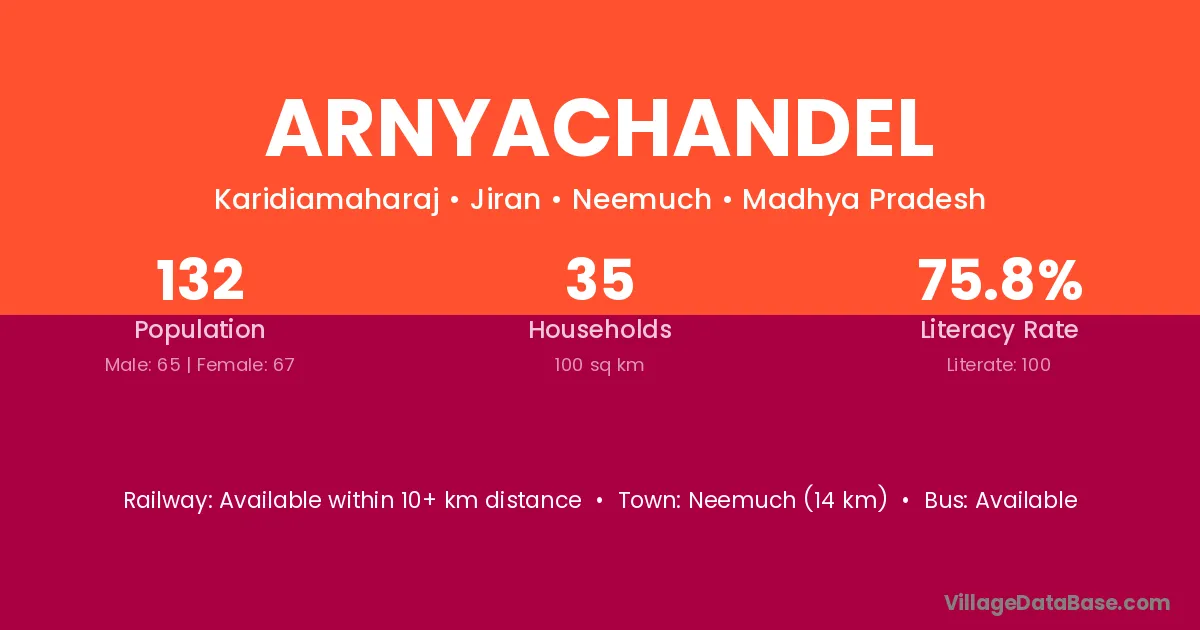Neemuch (14 km) is the nearest town to Arnyachandel village for major economic activities and is located approximately 14 km away.