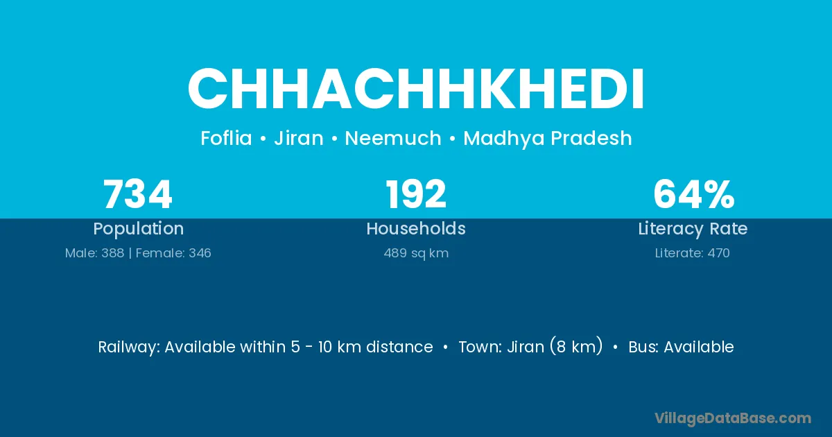 Jiran (8 km) is the nearest town to Chhachhkhedi village for major economic activities and is located approximately 8 km away.