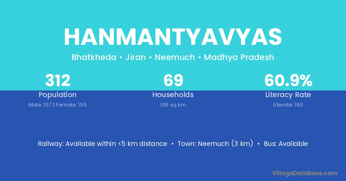 Neemuch (3 km) is the nearest town to Hanmantyavyas village for major economic activities and is located approximately 3 km away.