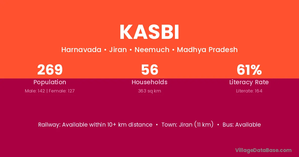 Kasbi village has a total population of 269 people, of which 142 are males and 127 are females.