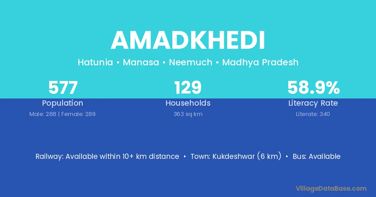 Kukdeshwar (6 km) is the nearest town to Amadkhedi village for major economic activities and is located approximately 6 km away.