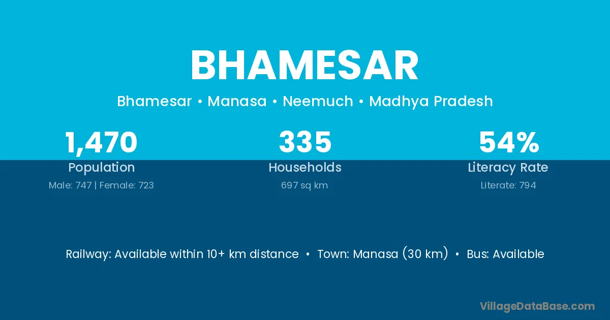 Manasa (30 km) is the nearest town to Bhamesar village for major economic activities and is located approximately 30 km away.