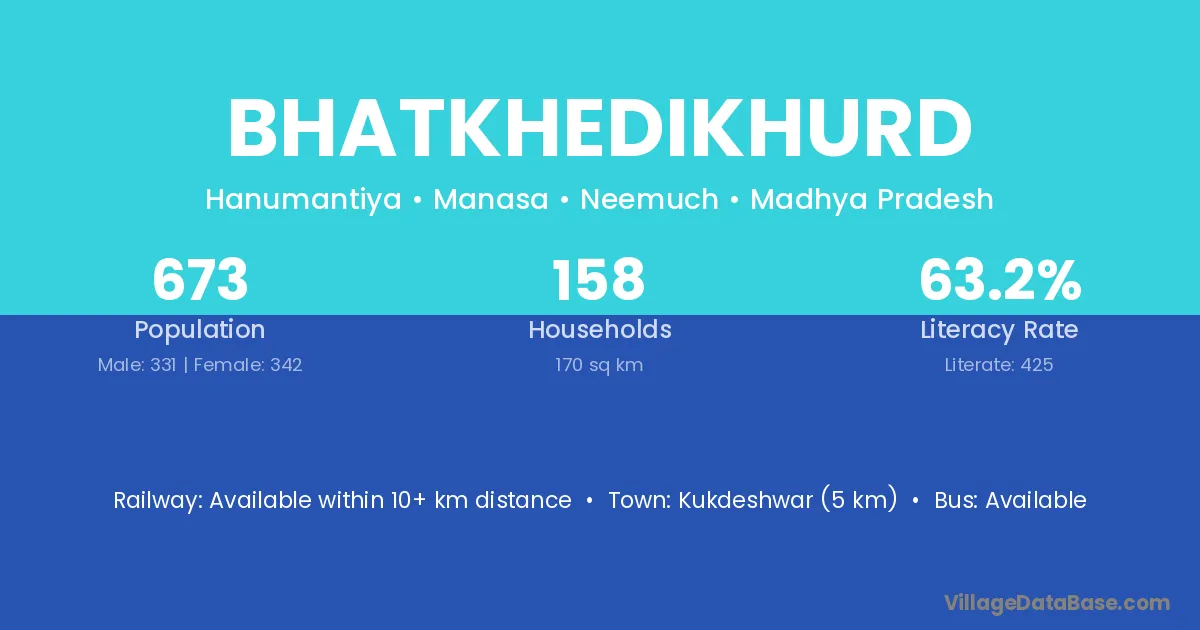 Kukdeshwar (5 km) is the nearest town to Bhatkhedikhurd village for major economic activities and is located approximately 5 km away.