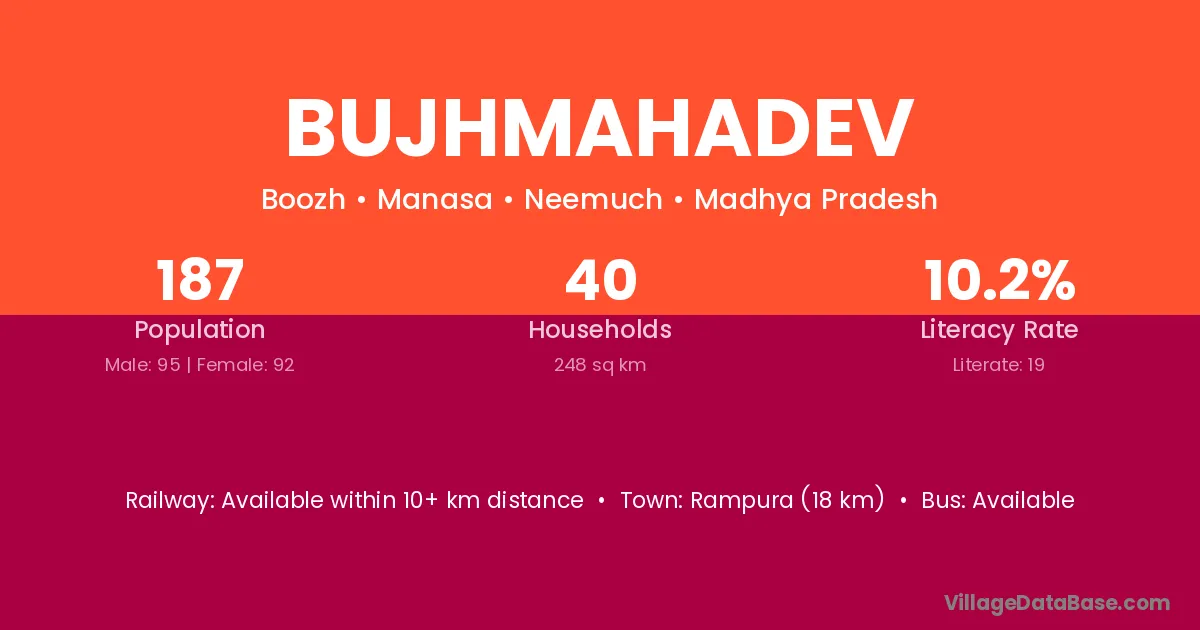 Rampura (18 km) is the nearest town to Bujhmahadev village for major economic activities and is located approximately 18 km away.