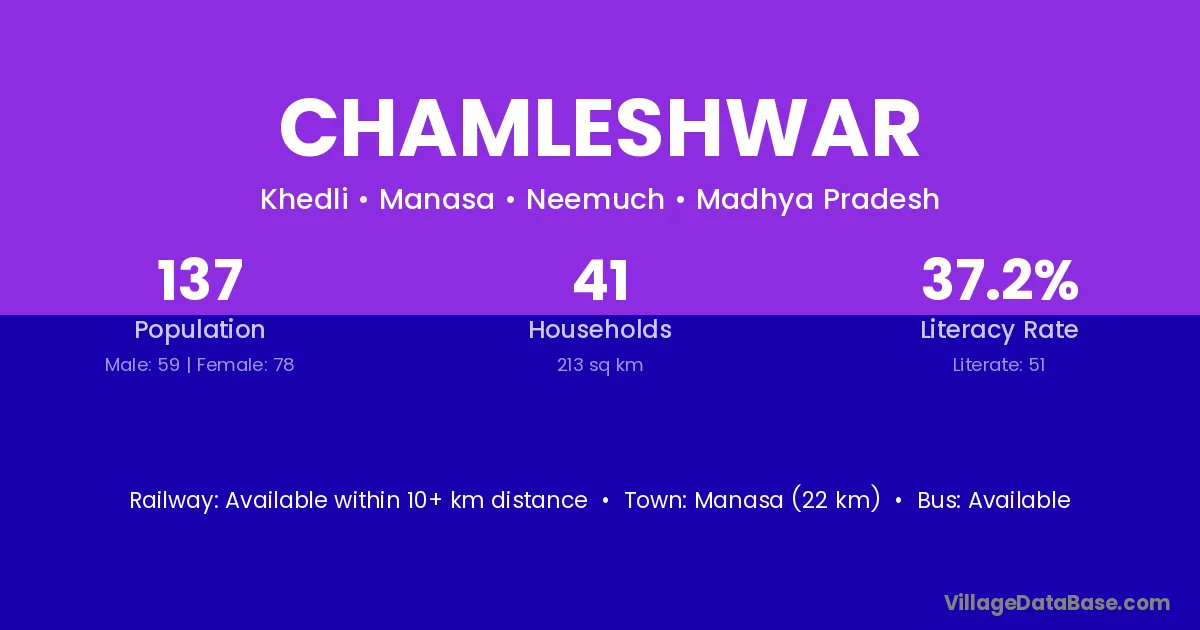 Chamleshwar village has a total population of 137 people, of which 59 are males and 78 are females.