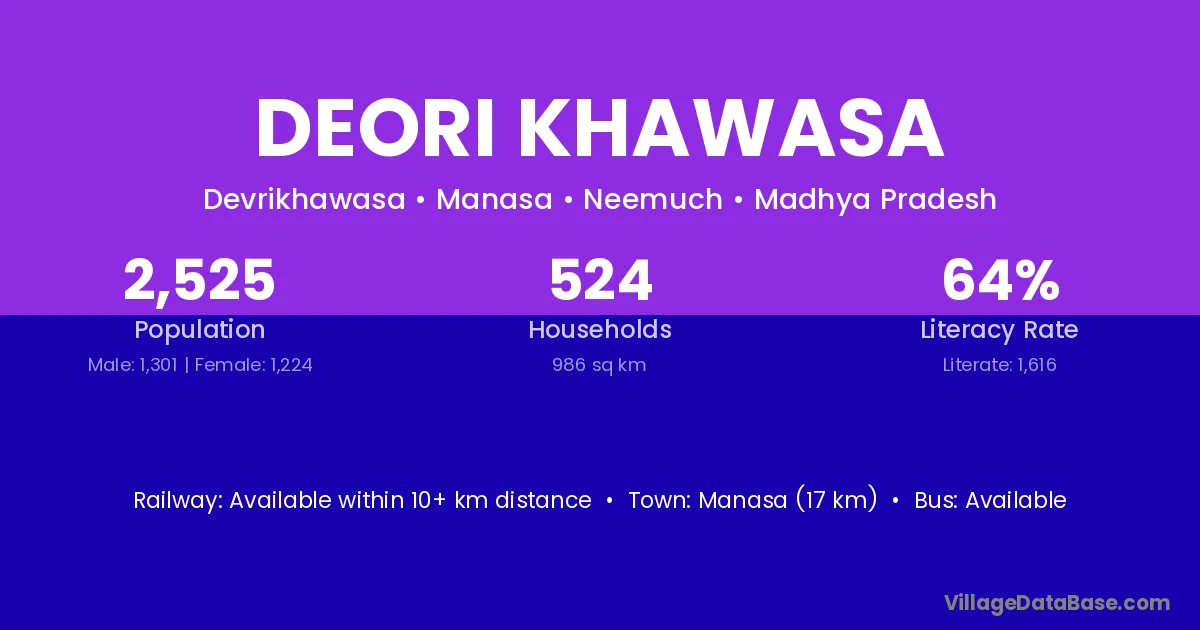Manasa (17 km) is the nearest town to Deori Khawasa village for major economic activities and is located approximately 17 km away.