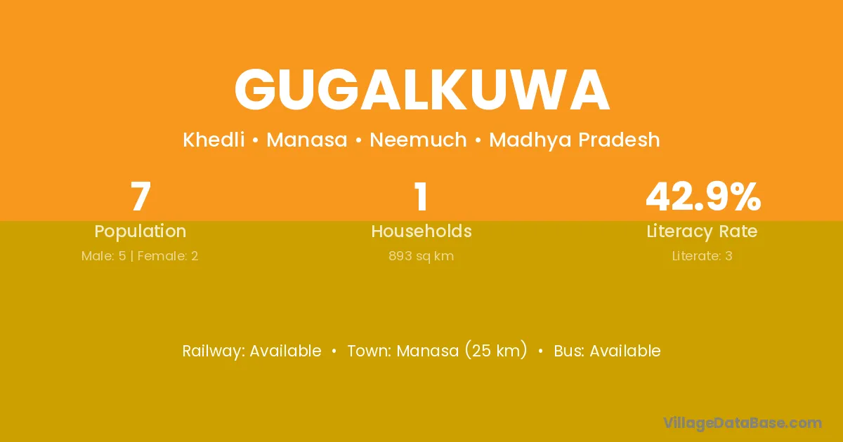 Gugalkuwa village has a total population of 7 people, of which 5 are males and 2 are females.