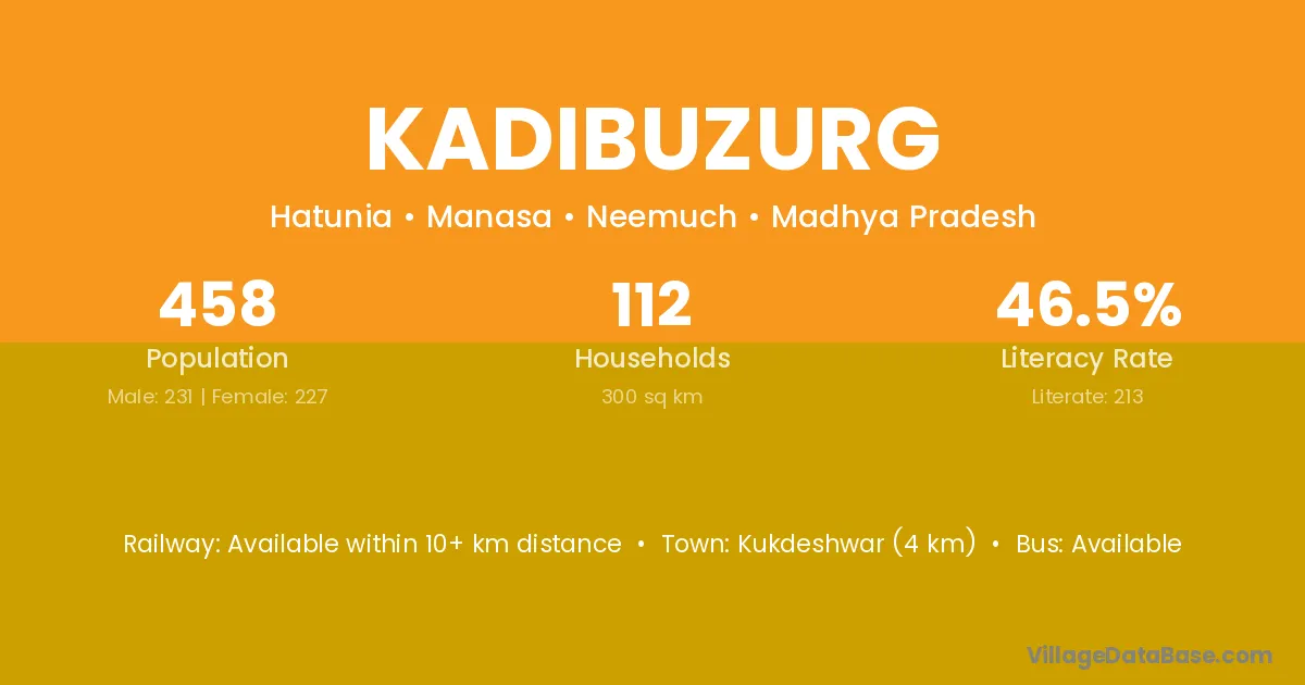Kukdeshwar (4 km) is the nearest town to Kadibuzurg village for major economic activities and is located approximately 4 km away.
