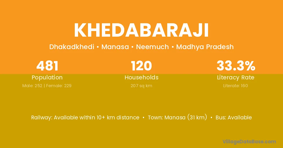 Manasa (31 km) is the nearest town to Khedabaraji village for major economic activities and is located approximately 31 km away.