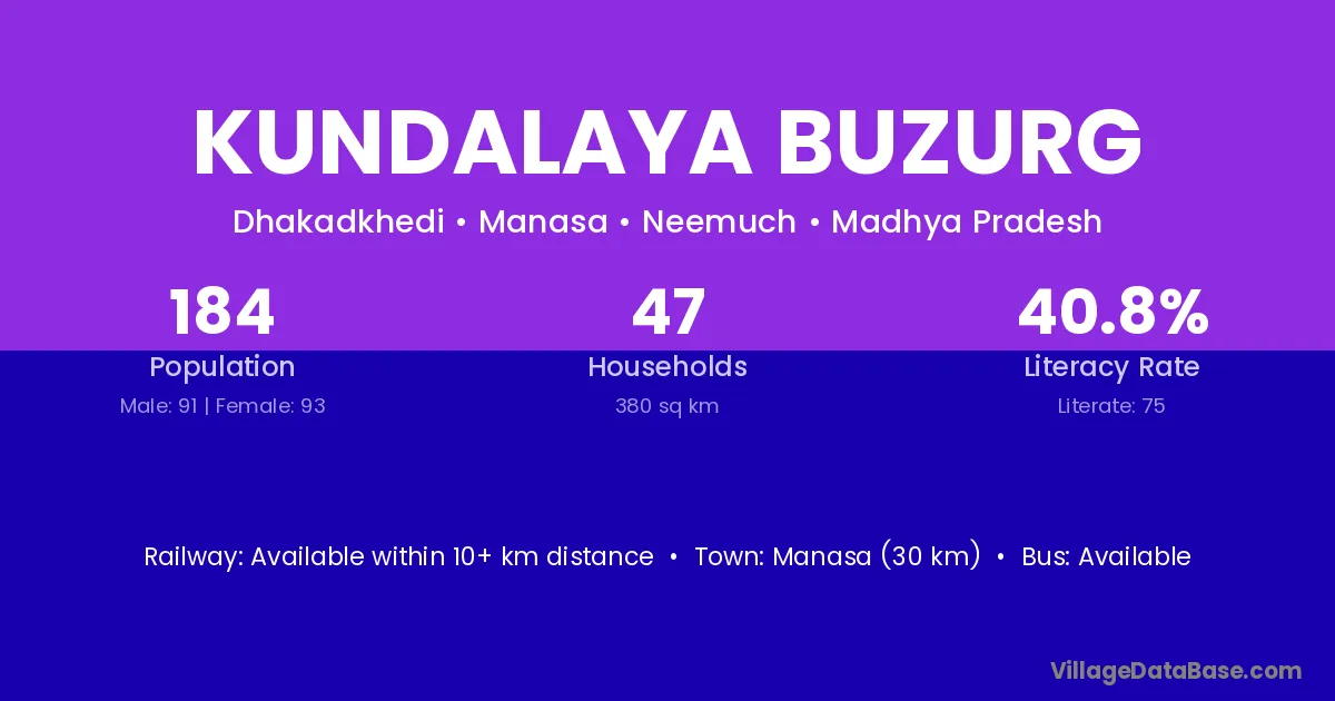 Manasa (30 km) is the nearest town to Kundalaya Buzurg village for major economic activities and is located approximately 30 km away.