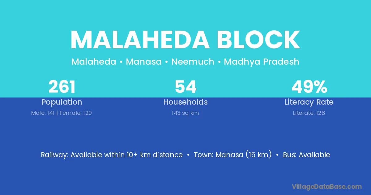 Manasa (15 km) is the nearest town to Malaheda Block village for major economic activities and is located approximately 15 km away.