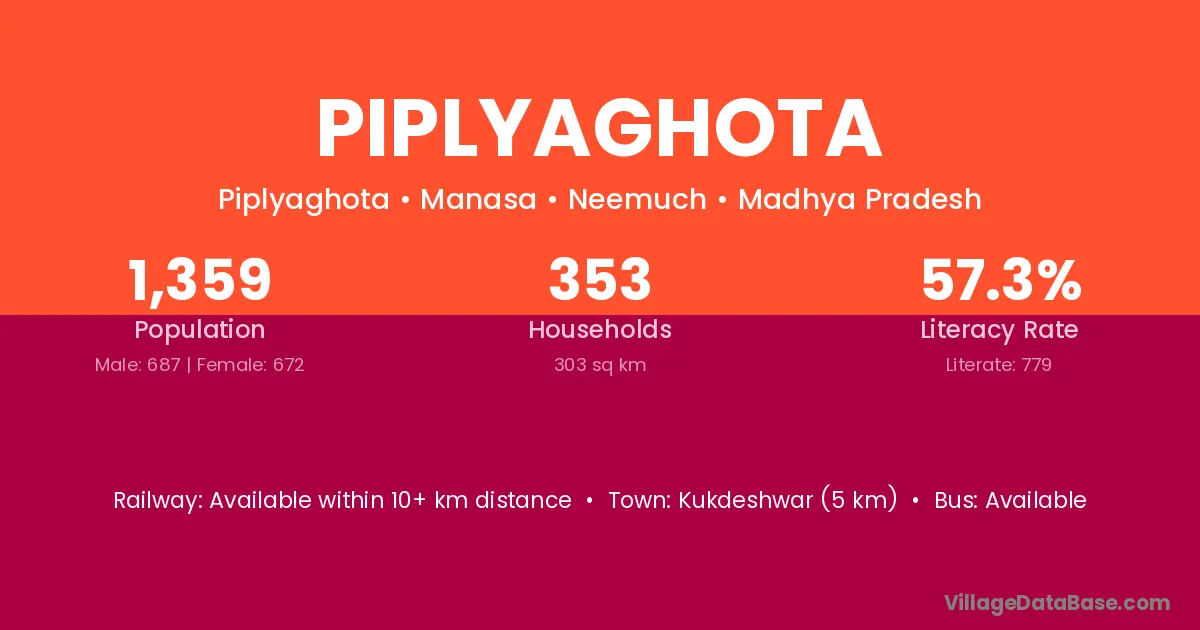 Kukdeshwar (5 km) is the nearest town to Piplyaghota village for major economic activities and is located approximately 5 km away.