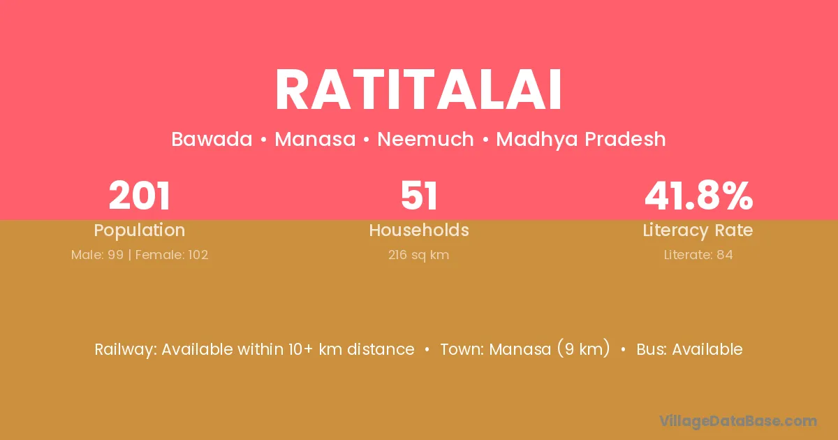 Ratitalai village has a total population of 201 people, of which 99 are males and 102 are females.