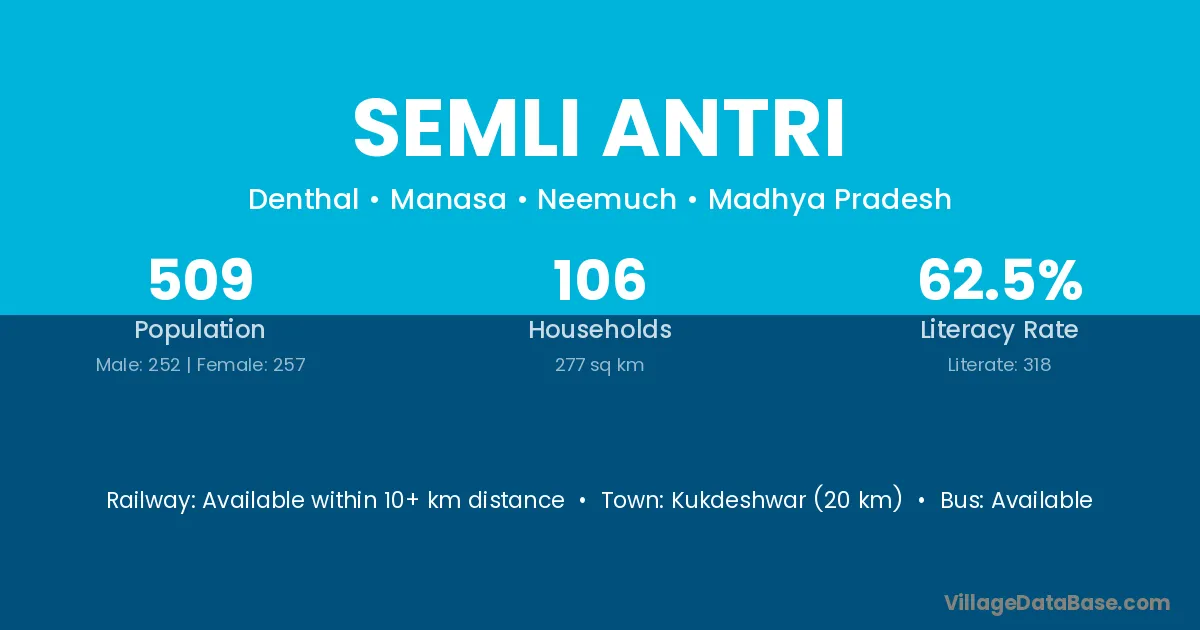 Kukdeshwar (20 km) is the nearest town to Semli Antri village for major economic activities and is located approximately 20 km away.