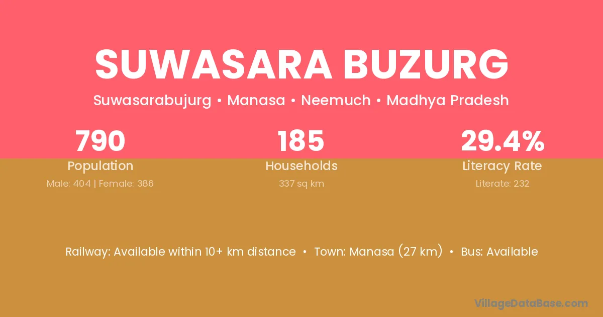 Manasa (27 km) is the nearest town to Suwasara Buzurg village for major economic activities and is located approximately 27 km away.