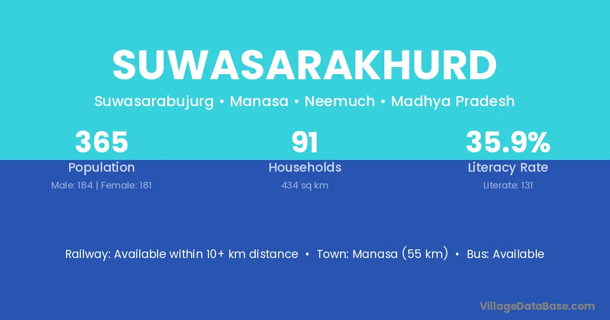 Manasa (55 km) is the nearest town to Suwasarakhurd village for major economic activities and is located approximately 55 km away.