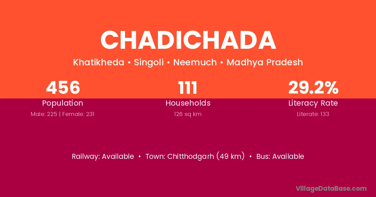 Chadichada village has a total population of 456 people, of which 225 are males and 231 are females.