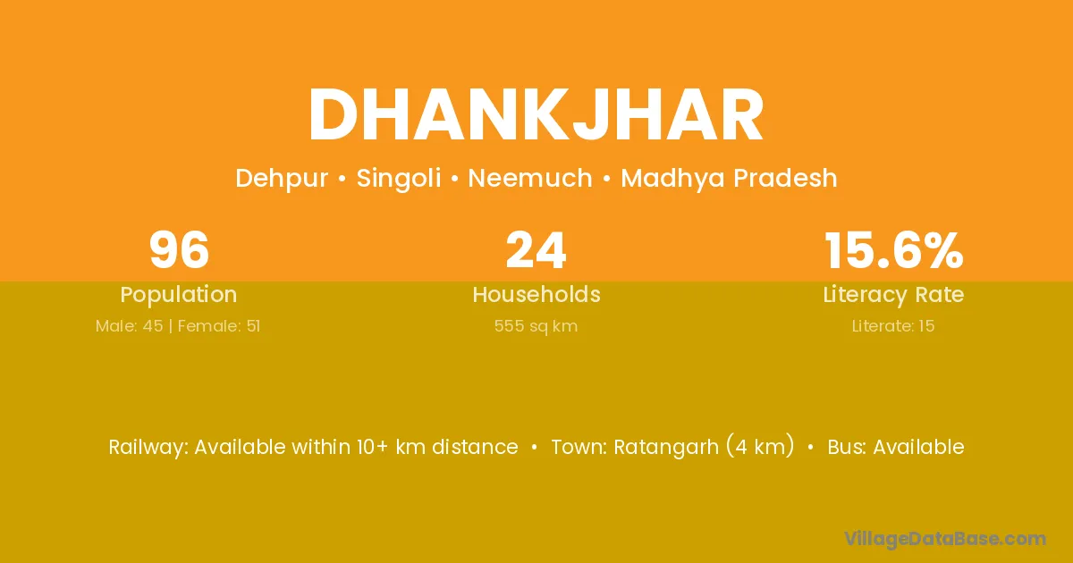 Dhankjhar village has a total population of 96 people, of which 45 are males and 51 are females.
