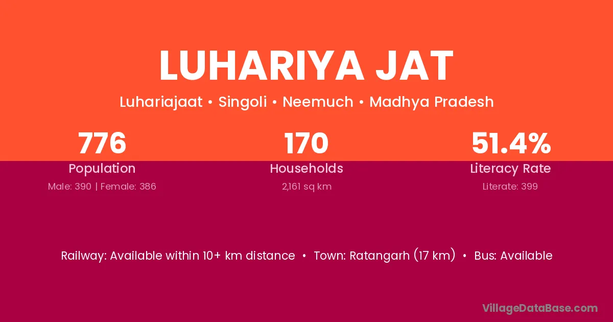 Luhariya Jat village has a total population of 776 people, of which 390 are males and 386 are females.