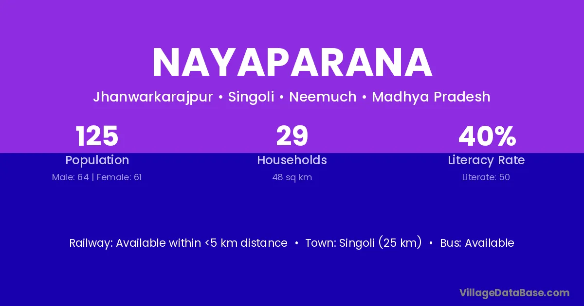 Singoli (25 km) is the nearest town to Nayaparana village for major economic activities and is located approximately 25 km away.