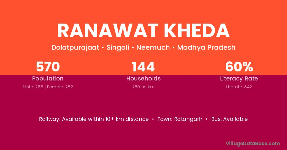 Ranawat Kheda village has a total population of 570 people, of which 288 are males and 282 are females.