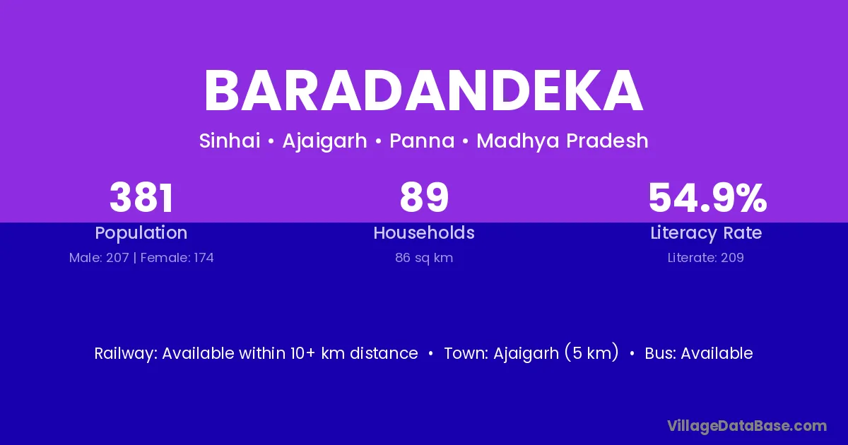Baradandeka village has a total population of 381 people, of which 207 are males and 174 are females.