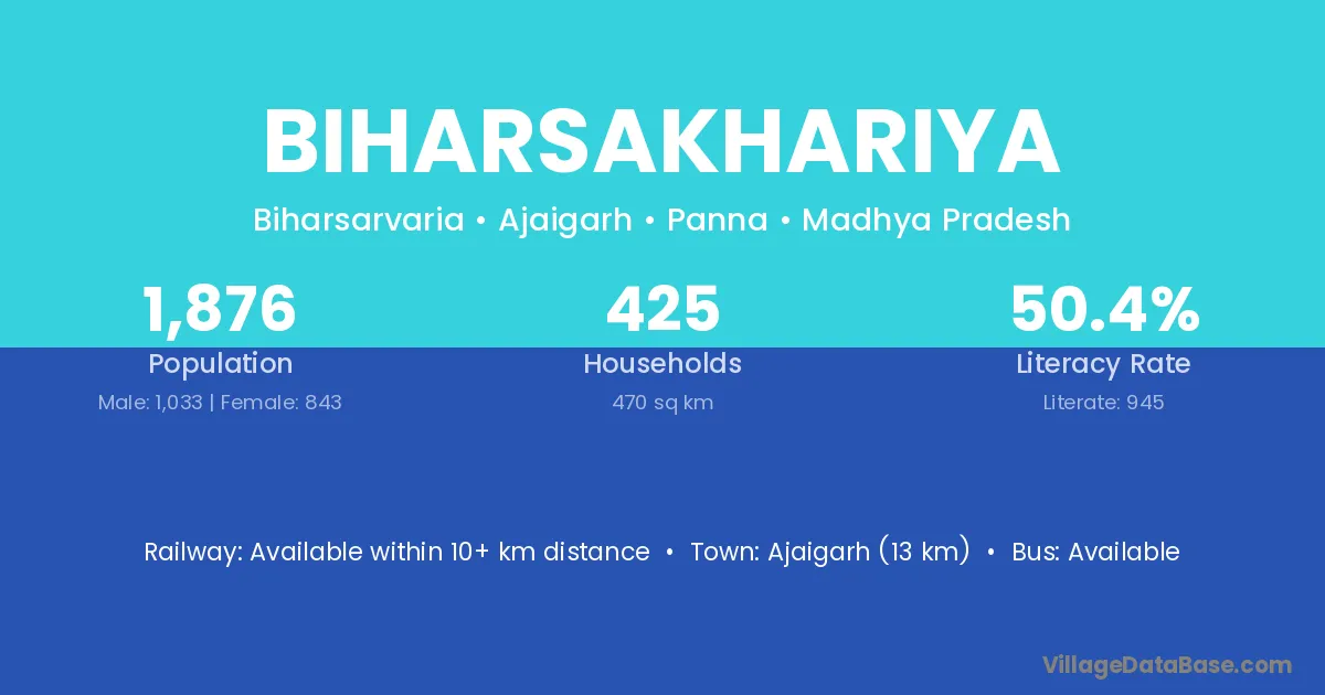 Ajaigarh (13 km) is the nearest town to Biharsakhariya village for major economic activities and is located approximately 13 km away.
