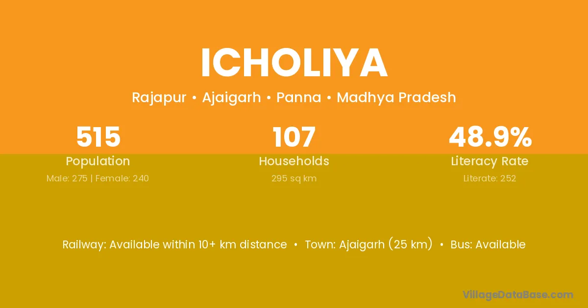 Ajaigarh (25 km) is the nearest town to Icholiya village for major economic activities and is located approximately 25 km away.