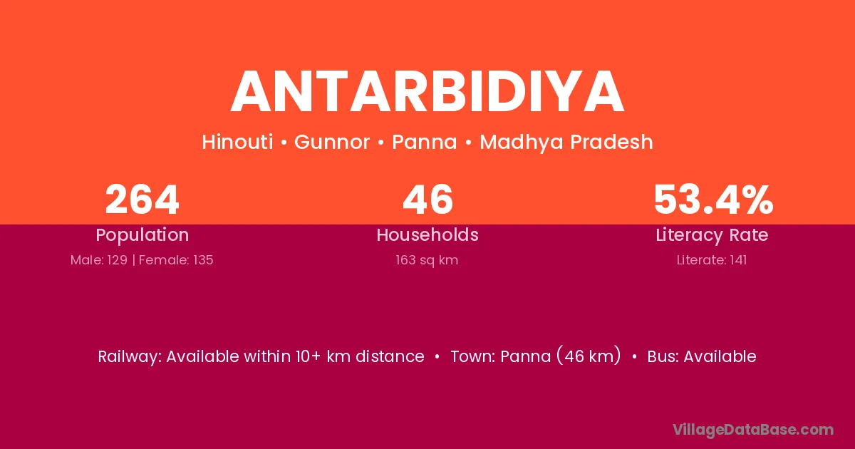 Panna (46 km) is the nearest town to Antarbidiya village for major economic activities and is located approximately 46 km away.