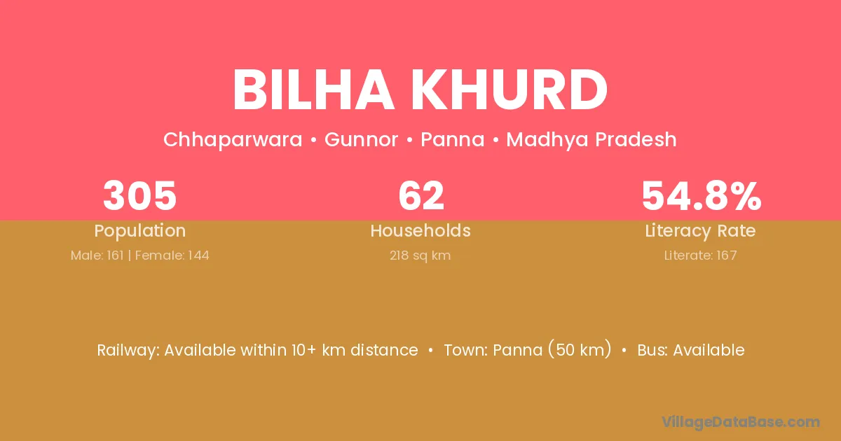 Panna (50 km) is the nearest town to Bilha Khurd village for major economic activities and is located approximately 50 km away.