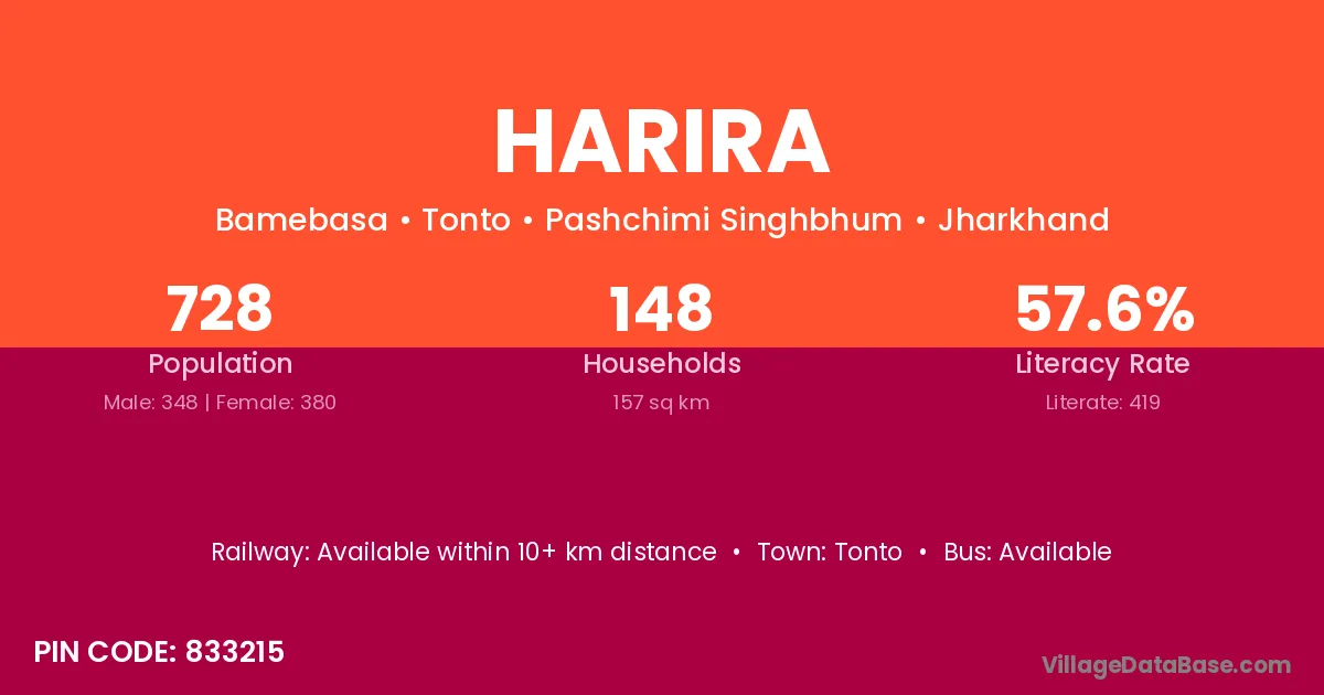 The literacy rate of Harira village is 55.40%. Male literacy stands at 71.68% and female literacy at 37.54%.