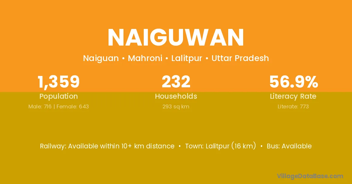 The literacy rate of Naiguwan village is 56.70%. Male literacy stands at 72.88% and female literacy at 38.68%.